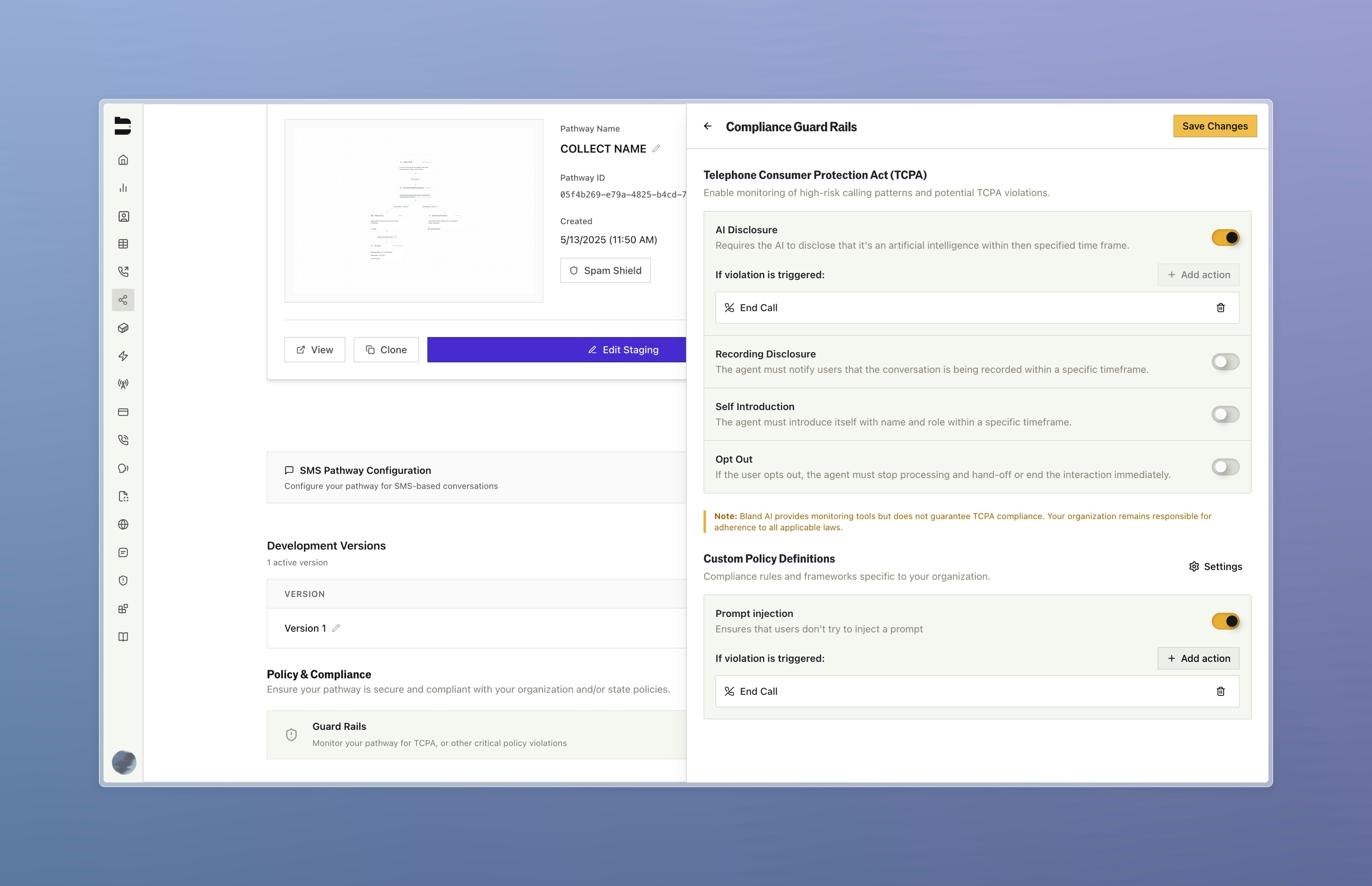 When a violation is detected, set actions will execute automatically:- End call - Immediately terminate the conversation