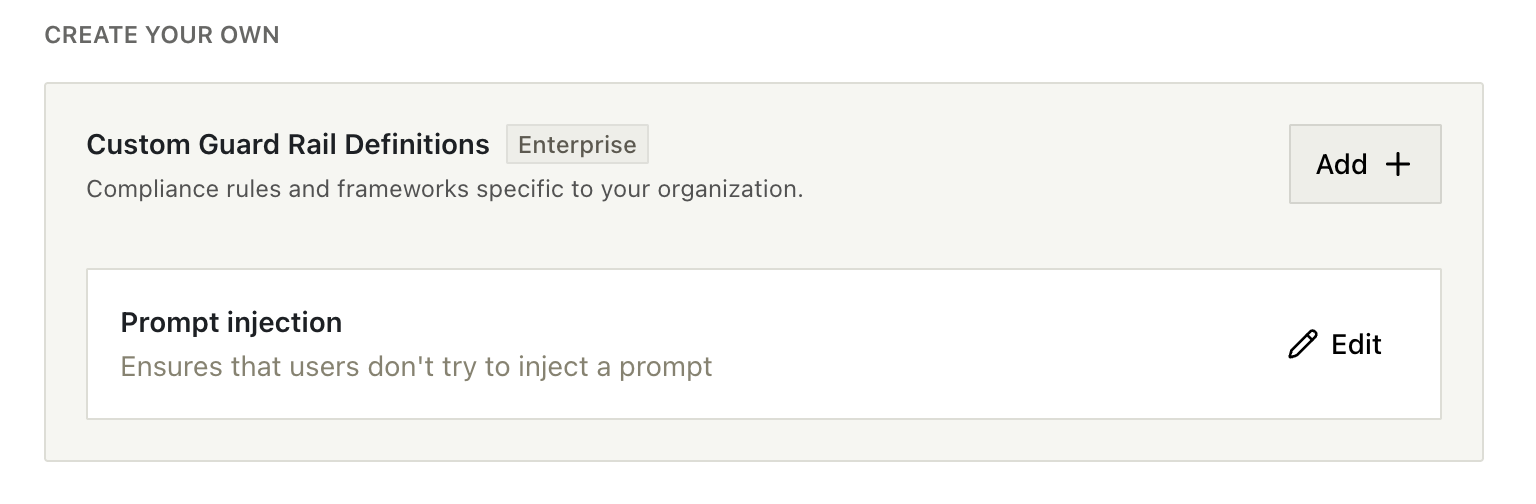 Enterprise customers can create up to 5 custom guard rails for industry-specific concerns/company policies. These are configured in the Enterprise Dashboard Compliance Settings.