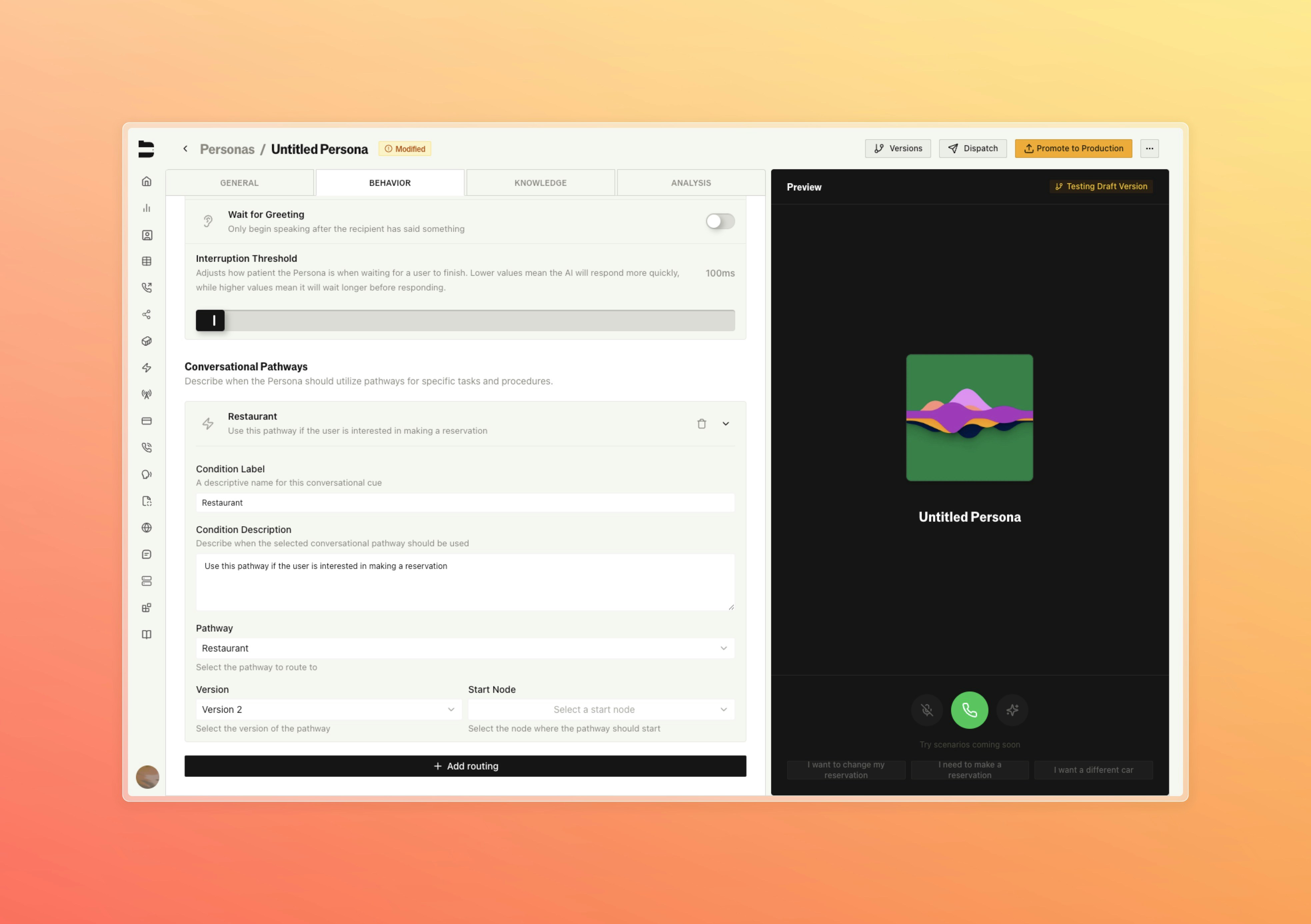 Configure your persona’s conversational behavior and routing logic.- General Behavior